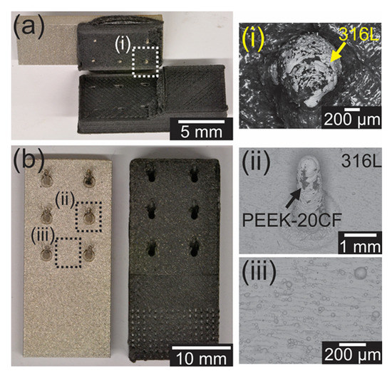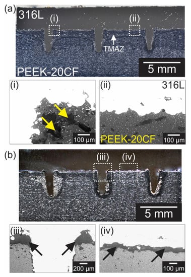 Figure 6b and its respective detail images (iii and iv) demonstrate that, for the vertical variation, the TTRs were also completely inserted. However, a proper micromechanical interlocking between the parts was not achieved, as almost the whole overlap area presents lack of filling of the metal surface cavities–indicated by the arrows in Figure 6b(iii),b(iv). This behavior indicates that the energy input reached in the vertical variation could not melt enough PEEK-20CF material to wet the whole metal surface. The low heat development was also not enough to create a visual TMAZ along the overlap area.