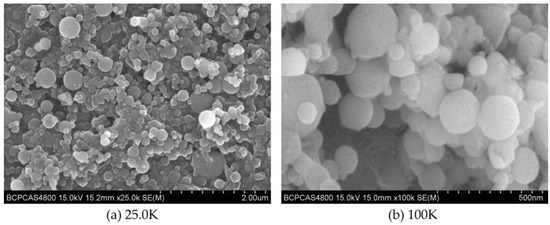 The prepared C8H18-Al samples were uniformly coated with conductive resin and sprayed with gold to obtain the surface samples for SEM measurement. The different magnifications of the C8H18-Al samples are shown in Figure 1a (magnification 25.0K) and Figure 1b (magnification 100K) in order to highlight the grain sizes and compare them. The test results of the C8H18-Al samples showed that the C8H18-Al nanoparticles were spherical in shape with regular forms and relatively smooth-looking surface textures. Most of the nanoparticles were less than 200 nm in size, but a few larger particles were still present in the field of view due to interparticle aggregation and the stacking of clusters.