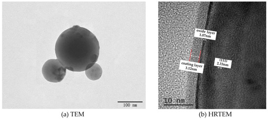 The imaging principle is basically the same for both SEM and TEM. SEM is able to observe only the surface morphology of the sample, while the electron beam of TEM is able to penetrate a certain thickness (about 50 nm) of the sample. Meanwhile, due to the different densities of the nanoscale aluminum particles and the shell structure of C8H18, the photographic results exhibited different gray levels. The milled C8H18-Al nanoparticle samples were dispersed in an anhydrous ethanol solution, sonicated, and then dropped on the microgrid and dried to produce samples for the TEM test. The TEM test results for the C8H18-Al nanoparticles are shown in Figure 2a. Here, it can be seen that brief ultrasonic oscillation alleviated the agglomeration phenomenon of C8H18-Al nanoparticles. The particles were intact in shape with smooth edges, indicating the structural stability of the in situ C8H18 coating.