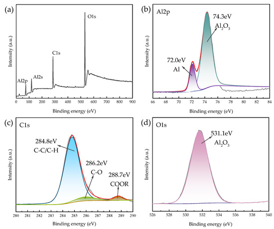 X-ray photoelectron spectroscopy (XPS) is capable of qualitative and semi-quantitative analysis of the chemical state and electronic structure of elements on the surface of solid materials (<5 nm). Since the sample itself contains elemental carbon, the 2 mg powder sample was glued to an ordinary double-sided adhesive. The C8H18-Al nanoparticles were dried to avoid solvent influence on the analysis results, and characterization was performed. The total spectrum was analyzed via inverse fold product analysis using the XPS PEAK software which is Avantage (Thermo Scientific, Waltham, MA, USA). No elemental signals were detected besides the presence of C, O, and Al, which were labeled. The results are shown in Figure 4.