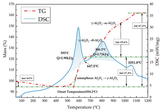 - The temperature varied between 693 and 945 °C. The oxidation reaction of aluminum nanoparticles occurred predominantly at this stage [29], and the mass of the sample increased by 25.6%. The second exothermic peak on the DSC curve at 806.2 °C corresponded to the conversion of γ-Al2O3 to θ-Al2O3, which was calculated to be 2.72 kJ/g. The decomposition of C8H18 at this phase was basically complete [20].