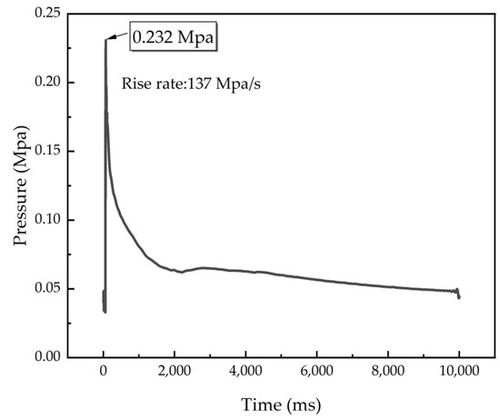 To further evaluate the energy generated by the combustion of C8H18-Al and the speed of the reaction, the differential pressure method was used to perform a confined exploder test to record the pressure generated during the combustion of C8H18-Al samples as a function of time. As shown in Figure 6, the maximum value of combustion pressure was 0.232 Mpa, and the maximum value of the pressure increase rate was 137 Mpa/s. Table 4 shows that the maximum pressure value for combustion of the C8H18-Al sample was higher than that of the micron aluminum powder and close to that of common nano aluminum powder. Nevertheless, the combustion rate of the C8H18-Al sample was about four times higher than that of the micron aluminum powder and normal nano aluminum powder. The results demonstrated that using C8H18 as a coating layer can enable aluminum powder to release energy rapidly. The test results for the heat of combustion were also verified.