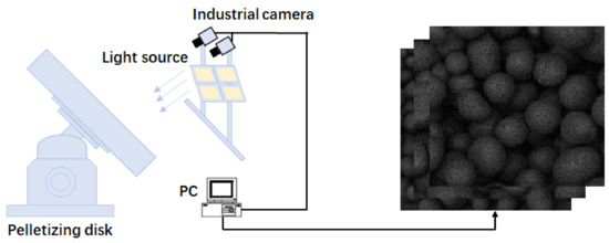 The development of machine visioning has laid a strong theoretical foundation for the promotion and application of image detection technology. The use of image detection technology to identify and detect the particle size of pellets can effectively overcome the shortcomings of the sieving method that relies on manual labor, and image detection can increase site safety and improve real-time detection. At present, some large- and medium-sized pellet plants are attempting to use machine vision technology as the basis of intelligent detection means through high-definition industrial cameras, which are used to collect images of the pellet-making site. The pellet image acquisition process as shown in Figure 1. The image segmentation algorithm is used to separate the pellets from the background, and the size of each pellet in the image and the overall size distribution are counted. However, since the pellets are not separated from each other in actual production, a large number of pellets are distributed in the form of adhesion and overlap, which makes the image segmentation of the pellets very difficult [2,3,4,5,6,7,8,9].