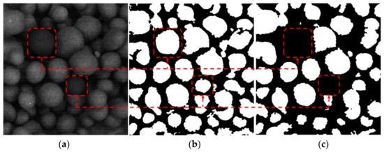Figure 3a is a pellet image with uneven grayscale, and the red dashed box area has a lower grayscale value. Figure 3b is the result obtained using the Nobuyuki Otsu method (Ostu) where, when the image brightness is not uniform, the red boxed area is treated with less grayness than the background, which causes mis-segmentation. Figure 3c shows the results obtained using the adaptive threshold segmentation method, which can effectively overcome the problem of foreground loss caused by uneven gray scale and realize the segmentation of the foreground and background.