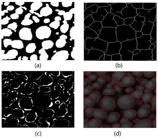 Watershed segmentation of the foreground area. (a) Defined foreground area. (b) The skeleton of the background area. (c) Missing foreground areas. (d) Final segmentation result.