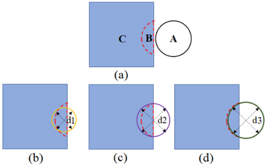 Some incompleteness in the edge area is caused by the interception of the image boundary, which is different from the incompleteness of the globules caused by occlusion, and so it is inaccurate to judge such globules by using only roundness. A new and different evaluation mechanism is used for the spherical clusters that are at the edges. The red dashed line in Figure 8a shows the contour of the sphere at the edge, and the new evaluation mechanism stipulates that the accuracy of the fit is higher when the effective area of the fitted circle intersects with the contour area of the sphere in a larger ratio. This can be expressed as follows: