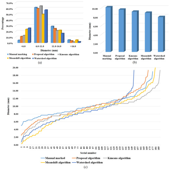 The segmentation results of the different algorithms are compared with the results of the manual marked method. In the marked watershed segmentation algorithm, the effect of overlapping pellet segmentation is poor, it is easy to lose the pellets with low gray levels, and the segmentation is sensitive to image noise. Because the choice of the marked area in watershed segmentation depends on the choice of the threshold value, when threshold selection is large, the number of marked areas is small, which leads to incomplete separation of overlapping pellets. When the threshold is small, the number of marked areas is large, which easily causes over-segmentation problems. When using the Meanshift segmentation algorithm, partially overlapping pellets are not separated, leading to large pellet size predictions. At the same time, some overlaps are over-segmented, resulting in small pellet size predictions. Because there is no need to specify the number of clusters in the pellets when using the Meanshift segmentation algorithm, it automatically estimates the number of clusters according to the shape of the connected domain of the particles, but the clustering result depends on the bandwidth setting. If the bandwidth is set too small, the number of clusters will be too large. If the bandwidth is too large, the number of clusters will be too large. When using the K-means segmentation algorithm, the number of overlapping pellet segmentations is relatively accurate, but the pellet size predictions are not accurate enough, which is due to the fact that the K-means clustering algorithm is applicable to data with circular distributions while the overlapping pellet data are unevenly distributed and have an approximate elliptical distribution, and so the inaccuracy of clustering leads to low accuracy in the pellet segmentation. In proposed algorithm, the K value and the initial center of the overlapping pellets are predicted by Gaussian reconstruction, which effectively avoids the problems of inaccurate segmentation and difficult convergence that are caused by the random initialization of the clustering center during the clustering process. In addition, when predicting pellet size, the proposed algorithm firstly determines whether it is an edge pellet or not, and it adopts different prediction methods for the sizes of the edge pellets and the non-edge pellets. Compared with the other algorithms, the proposed algorithm overcomes the problems of over-segmentation and under-segmentation, to a certain extent, and it has obvious advantages in the fitting of the edge pellets.