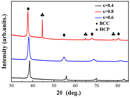 X-ray diffraction patterns of as-solidified HEAs with the compositions of (TiZr)x(NbTaV)1−x (x = 0.4, 0.6, and 0.8).