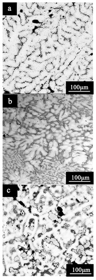 Figure 2 indicates the backscattered electron SEM images of the (TiZr)x(NbTaV)1−x RHEAs. Just like typical as-cast ingots, all alloys exhibited a clearly dendritic microstructure. At the same time, a few dark spots could be observed from the dendritic and interdendritic regions in all these alloys. These spots were associated with casting defects. The formation of dendrite structures indicates element segregation. The dendritic space of the three alloys was not significantly different, which was due to the similar cooling rates during the arc-melting solidification. The bright areas are dendrite arms, and the interdendritic regions appear to be dark on the SEM images. The brightness of the backscattered image depends on the atomic number, and the higher the atomic number, the higher the brightness of the image. This means that the elements with more electrons (such as Nb and Ta) were enriched in the dendrite arms. On the contrary, the elements such as Ti and V, which have smaller atomic numbers, were mainly distributed in inter-dendritic regions. The above situation is supported by many previously reported RHEAs, such as HfNbTaTiZr [10], NbTaTiV [14], and HfNbTiZr [15] RHEAs.