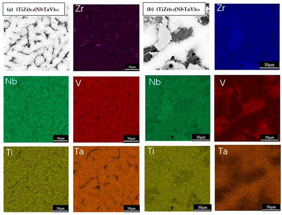 SEM and EDS mapping of Zr, Nb, Ti, V, and Ta in as-cast HEAs: (a) (TiZr)0.4(NbTaV)0.6 and (b) (TiZr)0.8(NbTaV)0.2.
