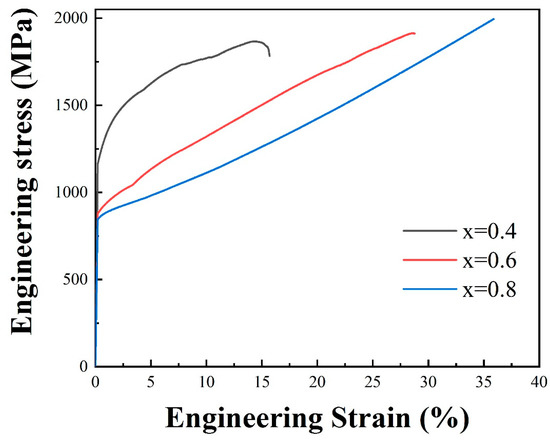 The engineering stress–strain (σ–ε) curves upon compression at room temperature for as-cast (TiZr)x(NbTaV)1−x HEAs (x = 0.4, 0.6, and 0.8) in this study are depicted in Figure 4. As can be seen in Figure 4, all three alloys had good strength and plasticity and exhibited work hardening. Table 2 provides the data on the engineering yield strength and compressive strain. The maximum error was less than 50 MPa and 2% for yield strength and failure strain, respectively.