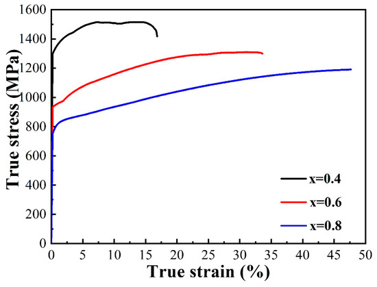Compressive true stress–strain curves for (TiZr)x(NbTaV)1−x (x = 0.4, 0.6, and 0.8) RHEAs at room temperature.