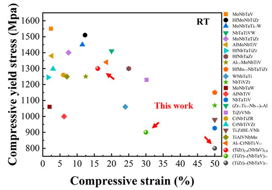 Compressive yield strength and plasticity of (TiZr)x(NbTaV)1−x RHEAs and some reported RHEAs at room temperature.