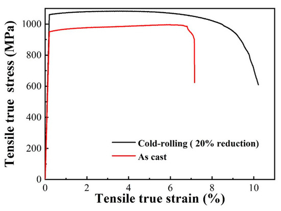 Because of the impressive compressive plasticity, further tensile experiments for the (TiZr)0.8(NbTaV)0.2 alloy were carried out. In order to better display the tensile properties of the alloy, the engineering and true stress–strain (σ–ε) tensile curves for the (TiZr)0.8(NbTaV)0.2 alloy at room temperature are presented in Figure 7 and Figure 8. From true stress–strain (σ–ε) tensile curves, the yield strength and plastic strains for the as-cast samples were 850 MPa and 7%, and the samples under cold rolling (20% reduction) showed higher yield strength (950 MPa) and plastic fracture strain (10%). These results show that the alloy has good tensile plasticity and strength at room temperature. The performance improvement after cold rolling may be related to the reduction in casting defects.