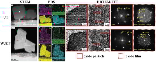 After the exposure experiment, the untreated (UT) and WJCP-treated 600 MA were removed from the autoclave for the observation of the change in corrosion behavior. Before the observation, all specimens were ultrasonically cleaned with ultra-pure water and ethanol, which is consistent with our previous work [14]. The surface morphology was observed using a ZIEES Sigma 300 scanning microscope (SEM, ZIEES, Germany) at an operating potential of 20 kV. Subsequently, FIB was used to prepare the TEM specimens at (111) orientation, which was marked by the combination of the hardness mark and electron backscatter diffraction (EBSD) measurement before the exposure experiment. Then, the cross-section morphology and the element composition of the oxide scales were analyzed using a TEM equipped with an energy-dispersive X-ray spectrometer (EDS). The structure of the oxide scales was analyzed from the EDS and the high-resolution TEM (HRTEM) images and the corresponding fast Fourier transformation (FFT).