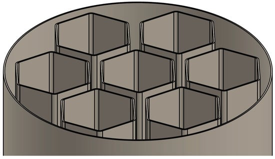 Sketch of the basket with hexagonal fuel assembly cells holding spent nuclear fuel. The basket of CASTOR®1000/19-type cask consists of 19 hexagonal cells [], with the length of the hexagon side of 150 mm and the total length of 4630 mm.