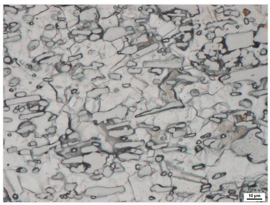 Won et al. [] proposed high-temperature annealing running a long period of time (up to 8 days) at 1180 °C to improve both the strength and ductility. Indeed, at such annealing conditions, brittle plate-like M2B particles [] transform into spherical shape particles with increased size. As the size of the particles grows, the density decreases. The microstructure is also more homogeneous with respect to the nickel and chromium distribution in the austenite matrix. The mechanical properties improve accordingly. Utilizing such an annealing procedure in practical production technology seems to be not cost-effective.