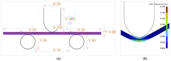 DEFORM® engineering software exploiting the finite element method (FEM) was used to simulate 3PB. The selected mesh consisted of a total of 3000 elements (Figure 3). Good accuracy was provided by 10 elements assigned to the sheet thickness. Due to the springback effect after the load release, the deformation analysis used an elastoplastic model of the workpiece. The 2D plane strain problem was solved assuming the same deformation throughout all the longitudinal cross-sections. The 3D strain effects on the sheet edges were omitted. Both the loading ram and the saddle supports were assumed to be rigid bodies. Since the increase in temperature due to deformation heat release is negligible, the temperature of all tools and the workpiece was set to the ambient temperature of 20 °C. The velocity of the loading ram was constant (10 mm/min) without any acceleration or deceleration. As the cross-head displacement increased, both the stress and the strain increased. In each step, the force exerted by the machine was predicted based on the current stress-strain state. The calculated values of the force were then compared to the measured values. In the case of the 2D model, the resulting force was acquired by multiplying the sheet width (20 mm).