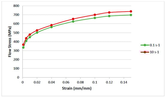 Recalculated engineering data acquired from quasi-static tensile tests (Table 2) provided true stress–strain curves describing the work-hardening of material. True stress–true strain curves without elastic contribution describe a work-hardening of the material, and they are utilized as so-called flow stress data in DEFORM (Figure 4).
