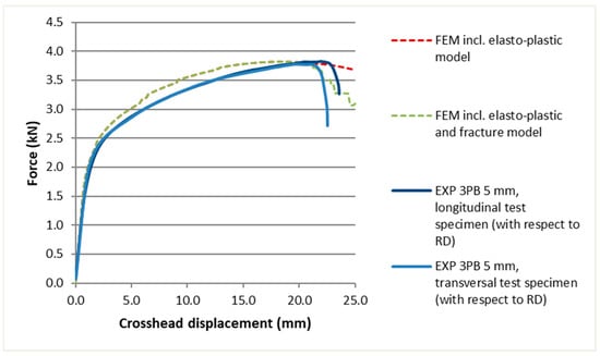 The observed values from the first 5 mm sheet 3PB test were in good agreement with the predicted values (Figure 5). For the estimation of the fracture initiation, the damage coefficient of 0.16 and the parameter of the softening method of 55% were determined. For pure curiosity, all 3PB experiments were carried out using both the longitudinal and the transversal test specimens with respect to the rolling direction. However, the difference was almost negligible, and no logical pattern was observed. It should be pointed out that all the presented results applied to the transversal test specimens. In practice, the sheet is always bent along the axis collinear with the rolling direction since the polygonal cell can reach a length of up to 5 meters.