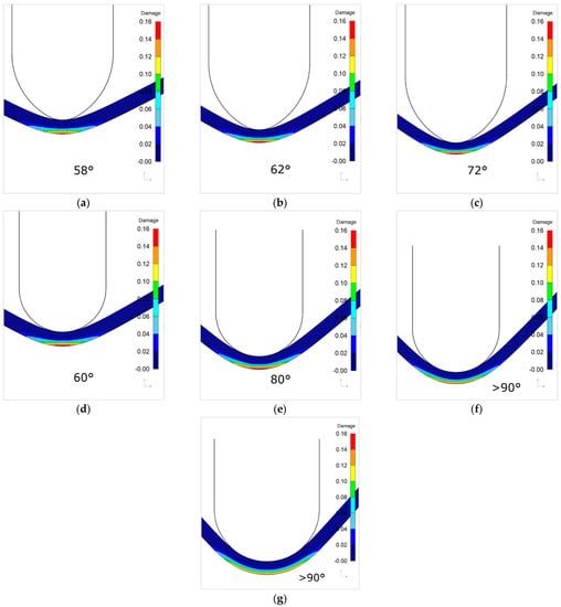 FEM simulated D.O.B. in the moment before fracture initiation: (a) 5 mm, R10; (b) 4.5 mm, R10; (c) 4 mm, R10; (d) 5 mm, R15; (e) 45 mm, R15; (f) 4 mm, R15; (g) 5 mm, R20.
