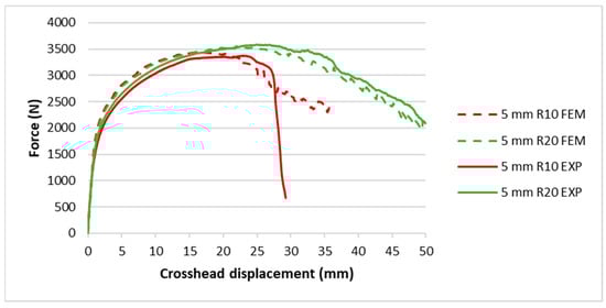 The correlation between FEM predicted and the experimentally measured relation between the force and the cross-head displacement for 5 mm sheet.