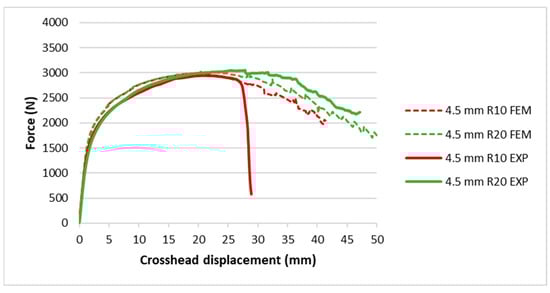The correlation between FEM predicted and the experimentally measured relation between the force and the cross-head displacement for 4.5 mm sheet.
