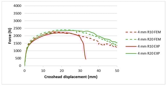 The correlation between FEM predicted and the experimentally measured relation between the force and the cross-head displacement for 4 mm sheet.