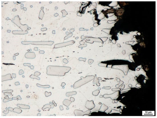 The voids, or cavities, are initiated by the brittle fracture of boride during the hot working of material (Figure 15). At high temperatures, the plastic flow can reduce the number of cavities. At lower temperatures, the plastic flow is not sufficient to fully heal the structure. When further deformation is applied, the austenitic matrix is severely deformed around hard boride particles. Increasing dislocation density accumulates the stress that is ultimately relieved through the fracture of borides. Cavities are then located between the boride fragments or around sharp particle edges. These cavities then serve as a nucleation site for the fracture.