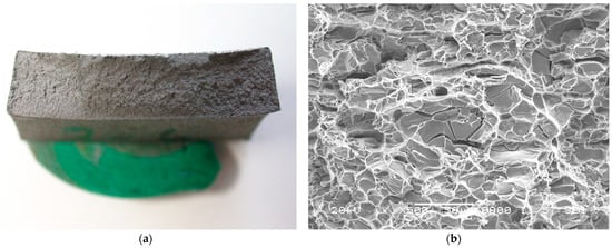 (a) Photography of the fracture; (b) SEM micrograph of a dimple rupture (the length of the bar in micrograph is 50 µm).