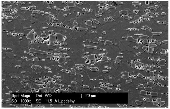 The cast ingot was first hot upset forged using a hydraulic forging press to destroy the as-cast structure by breaking up segregation, healing porosity, and promoting homogenization []. Afterward, the cross-section was reduced, and the forging stock was lengthened to obtain suitable slabs for the hot rolling process. Approximately 100 kg machined slabs were then hot rolled to 3.5–5 mm sheets using a reversible two-high rolling mill at COMTES FHT. Hot-rolled sheets were finally solution treated in a roller hearth furnace and cooled down in still air. The microstructure is shown in Figure 2.