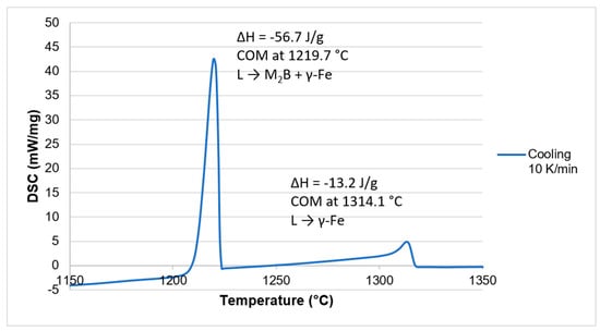 One of the factors contributing to room temperature cracking susceptibility could be the formation of hard and brittle intermetallic phases during the solution treatment. In practice, it is not convenient to water-cool annealed thin steel sheets because of severe distortion (fast cooling). However, air cooling might be slow enough to promote the sigma phase formation [] in the range of 580 °C to 780 °C. The sigma phase formation accompanies the loss of ductility and the defect formation in the microstructure. The presence of delta ferrite in austenitic alloys accelerates sigma phase precipitation. All ferrite-forming elements encourage the sigma phase formation because of two orders of magnitude slower chromium diffusion rate of chromium in BCC lattice in comparison to austenite FCC lattice []. According to Wang et al., borated stainless steels are less prone to delta ferrite formation than their non-borated counterparts. Increasing boron content gradually inhibits the formation of delta ferrite until no delta ferrite appears. Depending on the alloying concept of austenitic stainless steel, the critical boron content is around 1 wt. %B []. Nonetheless, differential scanning calorimetry (DSC) was conducted to get a closer look at liquid–solid phase transformation during solidification. Relatively low solidus temperature limits the temperature range for potential homogenization annealing. The cooling curve (Figure 16) shows only two exothermic peaks. Austenite crystallizes first from the liquid (center of mass at 1314.1 °C), followed by the eutectic boride structure (center of mass at 1219.7 °C). DSC provided enthalpy values for respective phase transformations as well.