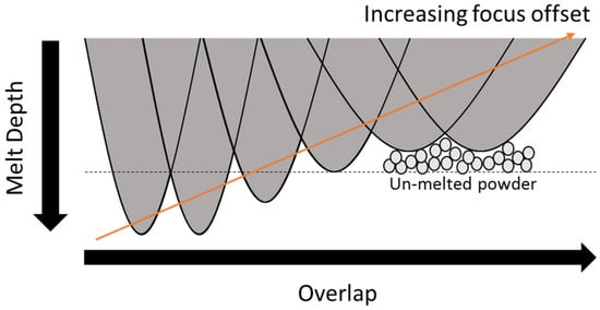 Defect generation in EBM is strongly influenced by the energy density of the electron beam. Energy density can be controlled by changing the focus offset (FO) of the electron beam, while keeping other processing parameters (such as beam power, scanning speed, etc.) unchanged [13]. The FO alters the current through the electromagnet/coil that the electron beam passes through prior to focusing on the powder layer. Changing the amount of current through this coil magnet offsets the focus plane of the electron beam, effectively changing the beam area and consequently the energy density, melt depth, and melt width [27,28,29,30]. Therefore, a higher FO produces a wider beam and lower energy density. The relationship between FO and thermal distribution, as well as melt pool size, has been modeled [30], as thermal distribution is an important component in printing quality. The FO parameter in this paper will be referred to in units of electrical current (mA). Note that because the effects of this coil are dependent on the machine configuration, such as the number of wraps and the coil gauge, the effects of FO and range for optimal properties are machine dependent.