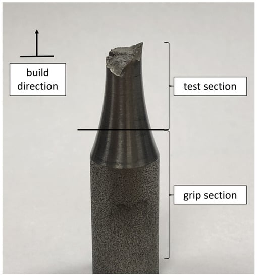 EBM was performed using an ARCAM machine with Ti-6Al-4V powder consisting of a 45–120 µm size distribution. Cylindrical volumes of material with a diameter of 15 mm were fabricated with a vertical build orientation, and all processing parameters other than the FO were kept constant for all specimens. These processing parameters, such as beam power, layer thickness, etc., were proprietary to the material supplier and not provided, as the objective was to investigate the effects of the defects, not their cause. Defects were generated in the material by adjusting the FO in the specimen gauge length to create varying defect sizes and shapes based on melt pool overlap and depth. To induce regions of un-melted powder, relatively high FOs were applied. Cylinders were printed using 36 mA, 44 mA, and 52 mA to form the test section area, and a lower FO was used to print the grip sections of cylinders. None of the cylinders were postprocessed to maintain the as-printed microstructure. Nine cylinders were printed for each FO. Each cylinder was machined via lathe to create a constant radius and reduced area gauge length. The reduced section’s diameter was 7.5 mm, and the machined specimen’s surface finish was left unaltered (Figure 2).
