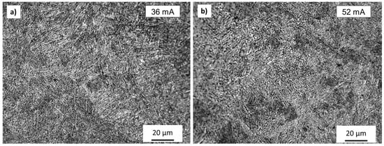 Representative micrographs of material manufactured via different FOs (a) 36 mA FO and (b) 52mA FO.