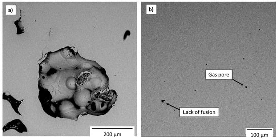 (a) Voids caused by un-melted powder and lack of fusion. (b) Microvoids caused by gas release and lack of fusion.