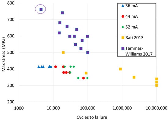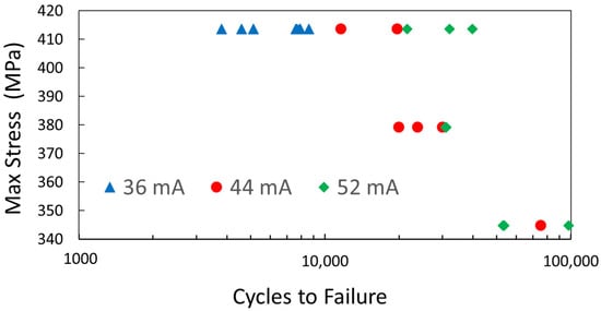 Three specimens in the 44 mA and 52 mA FO groups failed early on in the fatigue test (at 8 and 10 cycles, at 413.7 and 379.2 MPa, respectively for the 44 mA FO specimens and 17 cycles at 379.2 MPa for the 52 mA FO specimen). Failure occurred outside of the gauge length at the interface between the test section material and the grip material. One specimen in the 44 mA group was tested at an incorrect maximum stress due to a machine error. These four specimens were excluded from the analysis.