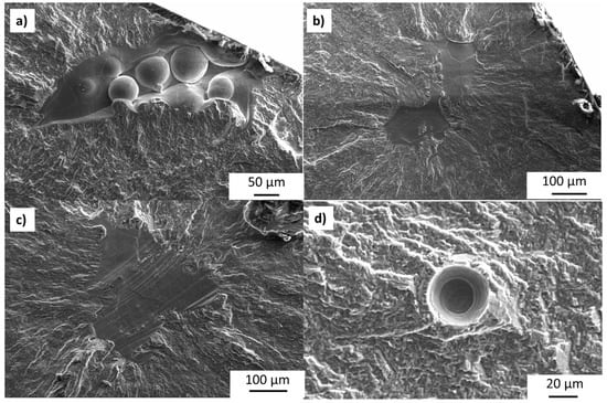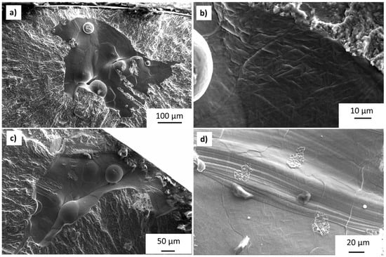 A further explanation of the cause of these defects is provided in Figure 11, showing magnified images of some regions of interest near smooth flaws. These images show features of both smooth texture with several un-melted powder beads in and around the flaw (Figure 11a,c). The presence of un-melted particles retaining their spherical shape on the surface is evidence of a lack of fusion. Figure 11d also supports this conclusion, though instead of spherical powder particles, the smooth facet texture (shown with surface lines) is interspersed with regions of ductile fracture. These regions of ductile fracture, with a texture suggesting void coalescence, could be due to particles that partially fused across the smooth flaw. The image in Figure 11b shows a higher magnification of surface texture on smooth facets, revealing a texture similar to the fine acicular alpha microstructure seen in the micrographs. This could be the texture above the melt if the smooth flaw was due to lack of fusion, or it could be the cleavage fracture through the microstructure, pointing to the quasi-cleavage mechanism for the formation of the smooth facet flaws.