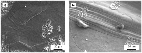 SEM imaging of polished sections after fatigue testing showed voids and porosity in all material groups. The voids observed on polished sections were categorized into two groups based on their size: large regions of un-melted powder (Figure 4a) and smaller voids, referred to as microvoids, due to either gas release or lack of fusion between fully melted material (Figure 4b). The size of the regions of un-melted powder were larger, ranging from 100 µm to 450 µm across, compared to the microvoids, which were typically in the range of 2–20 µm across. Lack of fusion voids were present in all material groups. These un-melted powder regions exhibited rough edges due to the un-melted particles and were observed on fracture surfaces across FOs, though their average size and quantity varied. The smooth facets observed on the fatigue-fracture surfaces were not present in the micrographs, though this could be due to the planar nature of the facets being parallel to the direction of sectioning, thus being less likely to appear in the material sections.