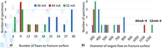 Failure generally appeared to initiate at regions where un-melted powder and/or smooth facets were present. Some evidence of gas pores was also present on the fracture surfaces, but these flaws were significantly smaller and less common than those due to un-melted powder or smooth defect failure and deemed less impactful to fatigue failure for the material used in this study. The average number of defects observed with a 3× magnifying glass and the average largest flaw size in each FO are provided in Table 3. Histograms displaying the distribution of the number of flaws and largest flaw diameter observed on each specimen’s fracture surface are shown in Figure 8. While no significant difference is discernible between the 44 mA and 52 mA groups in terms of number of flaws, by comparison, the lower 36 mA group is distinguished by a substantially higher number of flaws per fracture surface. Other than the two outliers, there is no notable statistical difference for the size of the largest flaws on fracture surfaces across all groups. The specimen numbers for the outliers are identified on Figure 8b for further discussion.