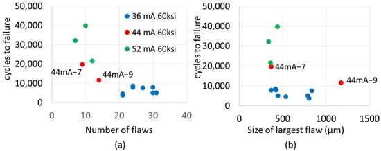 There is no conclusive trend relative to the size of the largest flaw vs. fatigue life in general (Figure 9b). Specimens containing flaws of approximately the same size exhibited substantial variance in fatigue life. When differences did exist between specimens with significantly different flaw sizes, it was not discernible whether flaw size alone dictated the variation in fatigue life. For example, specimen 44mA−9 contained a significantly larger surface flaw than the other 44 mA specimen tested at the same stress level of 413.7 MPa. Specimen 44mA−9 failed at 11,643 cycles relative to specimen 44mA−7, which failed at 19,677 cycles. As discussed in the previous paragraph, both specimens contained a smooth facet with surface lines; however, the smooth facet observed in specimen 44mA−9 was closer to the surface than specimen 44mA−7. There is not enough data to conclusively determine if the difference in fatigue life is due to the flaw being closer to the surface, the flaw being considerably larger, or aleatoric uncertainty. The other outlier, 52mA−4, was tested at 379.2 MPa and failed at nearly the same number of cycles (30,862) as its counterpart specimen 52mA−2 (31,125). Both specimens exhibited similar fracture surfaces with multiple flaws and smooth facet flaws, which seem to be more influential than flaw size. Prior studies have concluded that the flaw area normal to loading is more dominant in shortening fatigue life than the total volume of the flaw [40,42]. From the presented results and prior studies, it appears that flaw type, location, and other factors are more influential than the size of the flaw.