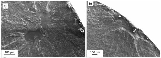 To explore this difference, the fracture surfaces for the 44 mA specimens tested at 413.7 MPa that exhibited lower fatigue lives than their 52 mA counterparts (Figure 9) are provided in Figure 10. Both specimens contained smooth facet flaws with surface lines, and these flaws are on or near the specimen surfaces. It is well established in the literature that pores near the surface shorten the fatigue life of specimens produced by both EBM and SLM [16,36,37,38,39,40]. Moreover, Xu et. al. [41] demonstrated the increase in stress concentration caused by pores within one diameter of the specimen surface relative to internal pores through a finite element study. It is evident from these specimens that these conclusions also pertain to smooth facet flaws. Both factors (flaw type and location) could account for the shortened fatigue life of the 44 mA specimens relative to the 52 mA specimens.