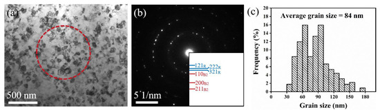 A JEM ARM-200F (JEOL, Tokyo, Japan) TEM instrument was employed to determine the grain sizes and microstructures at 200 kV. A precision ion thinner (PIPS 695, Gatan, Pleasanton, CA, USA) was used to fabricate the TEM samples, and the wires were manually ground to a 40 μm thickness using 800-grit sandpaper. The grain orientations and grain boundaries were characterized by the TKD technique, with a significantly improved spatial resolution in the range of 2–10 nm [26,27]. The ion thinned samples were used for the TKD scans, and a 500 × 500 nm2 area was scanned with a step size of 6 nm for each sample using a scanning electron microscope (SEM, TESCAN MIRA3, Brno, Czech Republic) equipped with an electron back-scatter diffraction (EBSD) detector. Fractography analysis was also performed using scanning electron microscopy in the secondary electron mode.