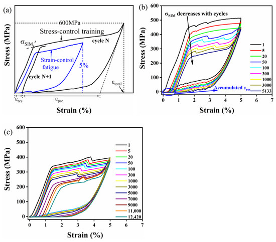The uniaxial strain-controlled cyclic fatigue tests were performed with a maximum strain of 5% for the as-received and trained samples, until failure occurred. The superelastic stress–strain responses and corresponding analysis are given in Figure 3 and Figure 4. The associated functional characteristics, i.e., , , and , are determined from the stress–strain curves, as schematically shown in Figure 3a. The accumulation of at cycle N is defined as the initial strain in the cycle N+1, as shown in Figure 3a.