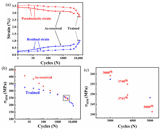 (a) indicates the evolution of pseudoelastic and residual strains, and (b) indicates the evolution of of the as-received and trained samples during fatigue tests. (c) is an enlarged view of the framed area in (b).