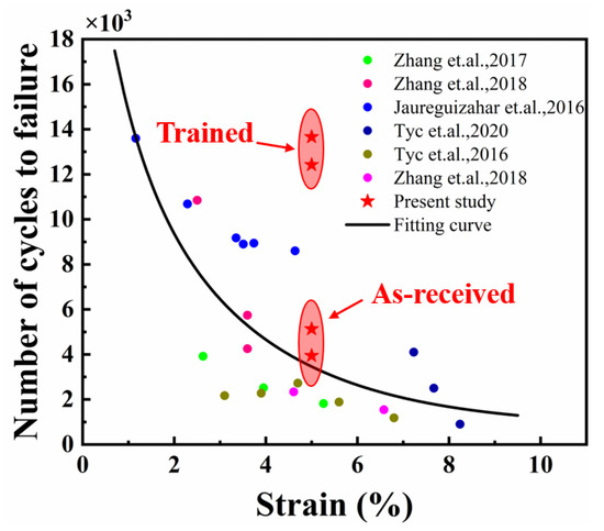 In addition to the improvement in functional stability, training also significantly increased the structural fatigue life of NiTi wires. In this case, a 187.4% improvement in average structural fatigue life after training was observed. Figure 5 presents a comparison of the number of cycles to failure for the superelastic NiTi SMA wires under pull–pull cycles described in this work and previous studies [5,6,28,29,30,31]. The structural fatigue life usually decreases with an increase in the maximum strain applied during the strain-control fatigue tests. The number of cycles to failure for the two as-received samples was 5133 and 3943, which was in line with the trend presented by the data in the literature. However, the fatigue life of the two trained samples reached 13,660 and 12,420 under the maximum strain of 5%, which was much higher than that reported in the literature. Thus, reasonable training was an effective means to improve fatigue resistance. The trained NiTi wires with outstanding fatigue resistance in the present study are a promising candidate material for the execution component with a lager applied strain.