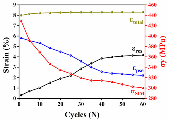 Evolution of critical stress to trigger stress-induced martensitic transformation (), total strain (), residual strain (), and pseudoelastic strain () during 60 cycles of training.