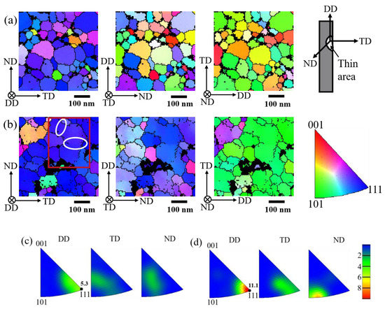 (a,b) The inverse pole figure (IPF) maps of the as-received and trained sample, respectively; (c,d) IPFs of the as-received and trained sample, respectively.