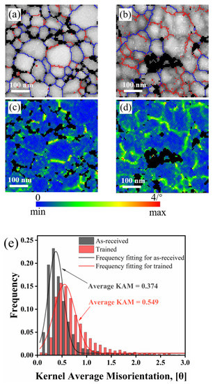 The comparison of the grain boundaries and the misorientations between the as-received and trained samples is shown in Figure 8a,b. Figure 8a shows that in the as-received sample, high-angle grain boundaries (HAGBs, >10°, marked by blue lines) were dominant, accounting for 70.6% of the boundaries, whereas the fraction of low-angle grain boundaries (LAGBs, 2–10°, marked by red lines) was only 29.4%. After training, the fraction of LAGBs increased to 59.6%. In some cases, several adjacent grains could not be distinguished in the IPF maps (the interfaces are marked by the white ovals in Figure 7b). Figure 8c,d presents the distributions of the KAM of the as-received and trained samples, respectively. Higher local misorientation regions were mostly distributed at the LAGBs, indicating that training-induced dislocations were associated with the formation of LAGBs. Figure 8e shows that the distribution of the local misorientations and average KAM values of the as-received and trained samples were 0.374 and 0.549, respectively. This result indicated that the geometrically necessary dislocations (GNDs) density increased by 46.8% after training because the GND density is proportional to the KAM value [35,36]. The significantly increased volume fraction of LAGBs with a high density of GNDs for the trained sample provided more evidence that lattice rotation occurred during training.
