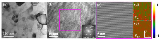TEM observation of the as-received sample: (a) bright-field images; (b) high-resolution transmission electron microscope (HRTEM) images; (c–e) show the inverse fast Fourier transformation (IFFT) images and the geometric phase analysis (GPA) images of the pink square domain in (b).
